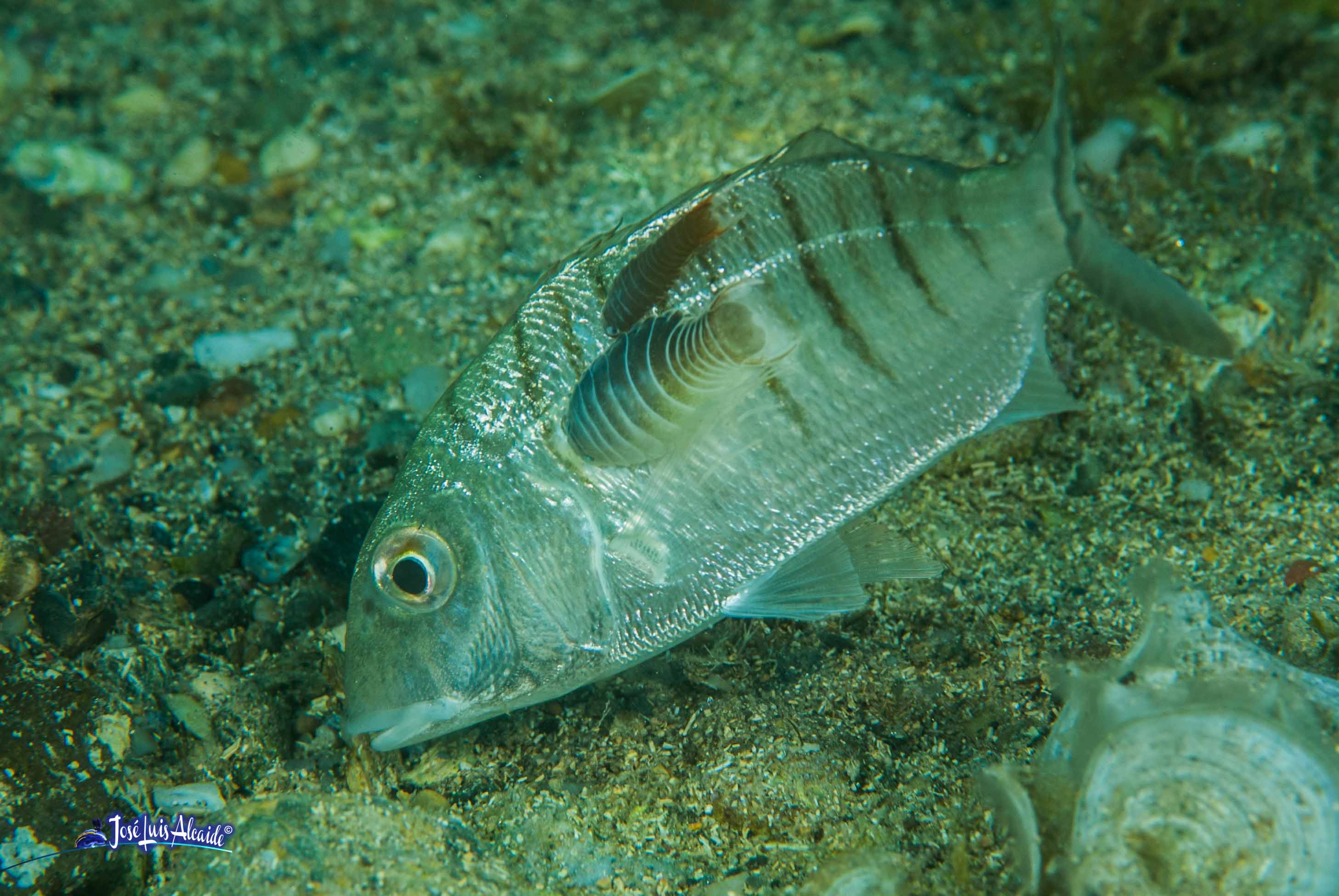 El ejemplar de color blanco fotografiado, salió desde las entrañas de un sargo Diplodus vulgaris que yacía en el fondo marino. Claramente se alimentaba del cuerpo.